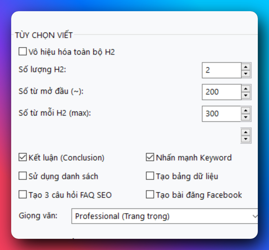 Một bài viết xếp hạng cao cần có cấu trúc chuẩn mực. vMix Content SEO Writer v9.0 cho phép người dùng can thiệp sâu vào các tùy chọn viết như: thiết lập số lượng thẻ H2, độ dài đoạn mở đầu, và giới hạn số từ cho từng mục. Hệ thống còn tự động in đậm (Bold) các từ khóa quan trọng, tạo bảng dữ liệu (Data Table) và danh sách liệt kê (Bullet Points) để tăng khả năng xuất hiện trên Google Snippets.