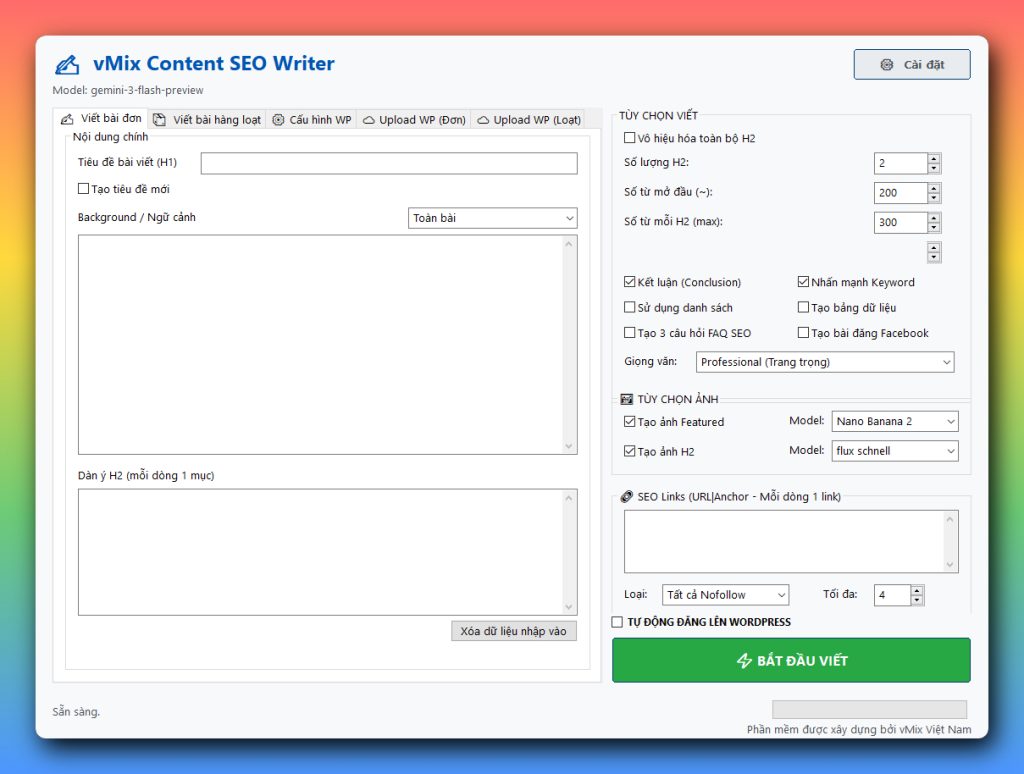 Phần mềm này không chỉ đơn thuần là một công cụ hỗ trợ viết lách mà còn là một hệ sinh thái kết hợp giữa trí tuệ nhân tạo và quy trình xuất bản chuyên nghiệp. Bằng cách tích hợp trực tiếp các mô hình ngôn ngữ hàng đầu như Google Gemini 2.5 Flash/Pro cùng khả năng đồ họa của Fal.ai, hệ thống cho phép người dùng kiến tạo những bài viết dài, chuyên sâu và có tính thẩm mỹ cao. Mọi thao tác từ lập dàn ý, triển khai chi tiết đến đăng tải lên website đều được xử lý tự động, giúp tối ưu hóa điểm số SEO và tăng khả năng hiển thị trên kết quả tìm kiếm.