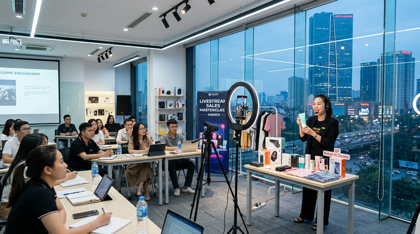 Tỷ lệ chuyển đổi từ các phiên livestream bán hàng phụ thuộc trực tiếp vào khả năng điều phối và xử lý kỹ thuật của người đứng máy lẫn người dẫn chương trình. Tại khu vực Hà Nội, nhu cầu chuẩn hóa đội ngũ livestream đang tăng cao khi các thuật toán hiển thị trên các sàn thương mại điện tử liên tục thay đổi. Thấu hiểu thực tế này, vMix Việt Nam mang đến chương trình đào tạo chuyên sâu, giúp học viên làm chủ hoàn toàn quy trình từ chuẩn bị kịch bản đến vận hành thiết bị. Với thời lượng 10 buổi học, mỗi buổi kéo dài 2 giờ, khóa học tập trung vào việc giải quyết triệt để các lỗi thường gặp như âm thanh kém, ánh sáng không chuẩn hay sự lúng lúng khi đối diện với khách hàng trực tuyến. Chúng tôi cam kết mang lại giá trị thực tế, giúp doanh nghiệp và cá nhân tối ưu hóa chi phí vận hành trong khi vẫn đạt được hiệu quả doanh số cao nhất. Lịch khai giảng liên tục hàng tháng tạo điều kiện thuận lợi cho những người bận rộn có thể sắp xếp thời gian tham gia một cách linh hoạt và bài bản.
